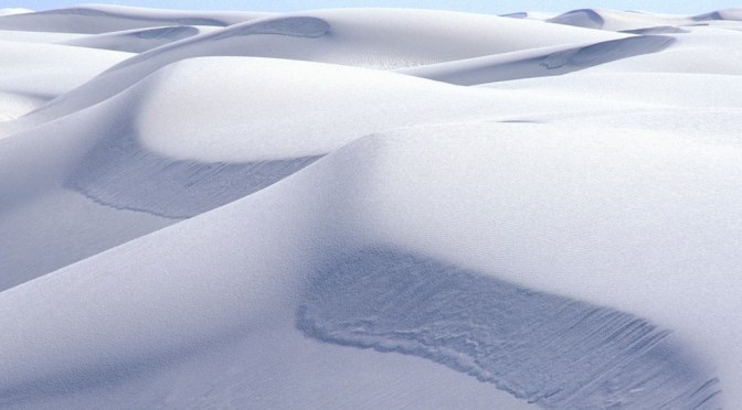 There are gentle rolling dunes like you would see in pictures of the Sahara, only the sand is as white as snow. Although it is always sunny and hot there, the sand itself never gets hot. There are almost no living creatures to be seen there, save stark black, beautiful beetles and the occasional bird.